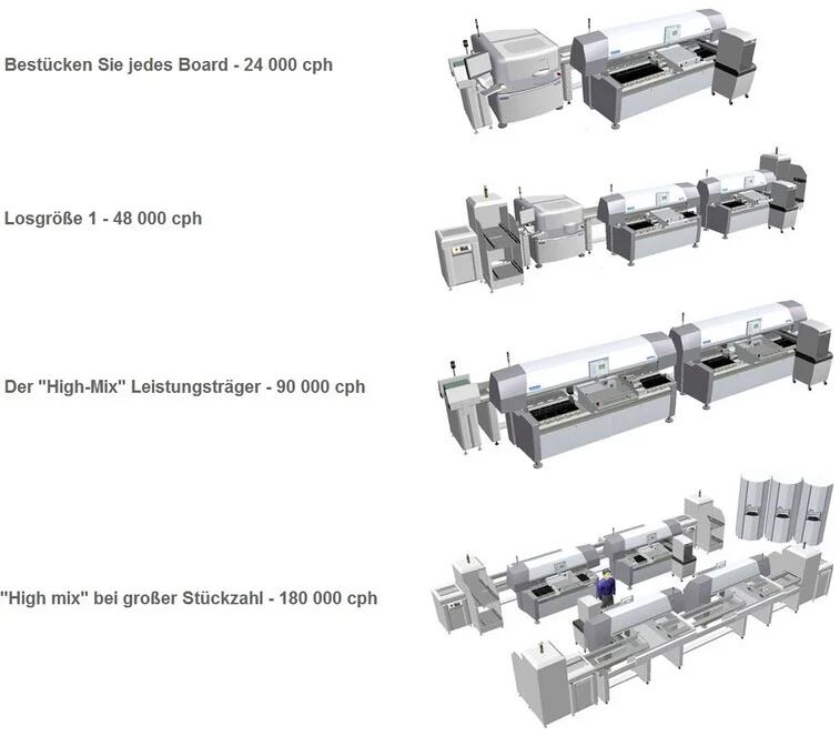 Im Bereich der flexiblen Bestückungslinien existieren eine Vielzahl von Möglichkeiten. Zwischen 16.000 und 180.000 Bauteile / Stunde lassen sich verschiedene Konzepte aufbauen. Eine kleine Linie kann mit den Jahren bis zu einer hochleistungsbestückung ausgebaut werden. Weitere Details zu Ansätzen um die Flexibilität gerade im Bereich der oft wechselnden Losgrößen zu erhöhen finden Sie unter Ergänzungen. Alle Ansätze haben als Hintergrund eine Minimierung der Rüstzeiten bei entsprechender Bestückleistung zu bieten. Hierbei spielen neben dem Bestücker auch Jet-Dispenser als schablonenloses System für den Patenauftrag und SMD-Tower als flexibles Lagersystem eine entscheidende Rolle.