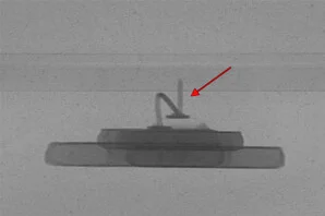 Durch die hohe Leistung der Yxlon Röntgensysteme können Metallgehäuse (siehe linker Teil auf dem Bild) durchstrahlt werden und die interessanten Teile im Gehäuse, beispielsweise die Elektronik inspiziert werden.